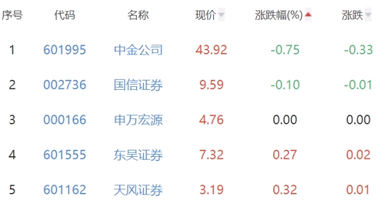 中金公司、国信证券、申万宏源、东吴证券、天风证券位列涨幅榜后五位,涨幅分别为-0.75%、-0.10%、0.00%、0.27%、0.32%。