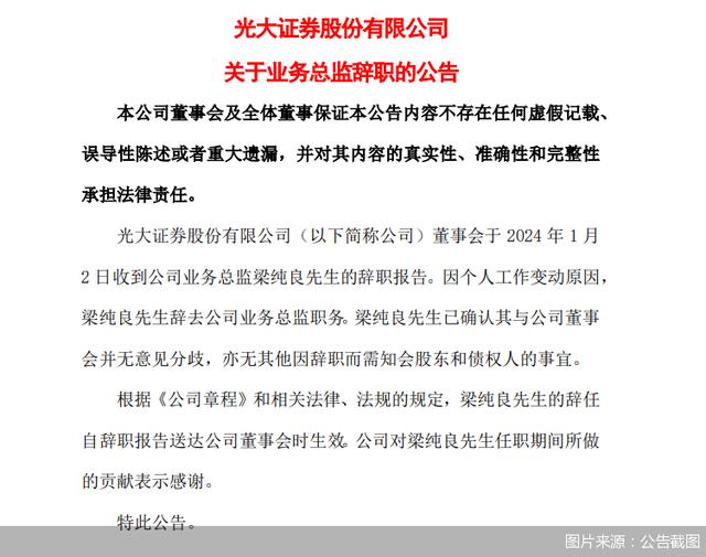 光大证券:梁纯良因个人原因辞去业务总监职务
