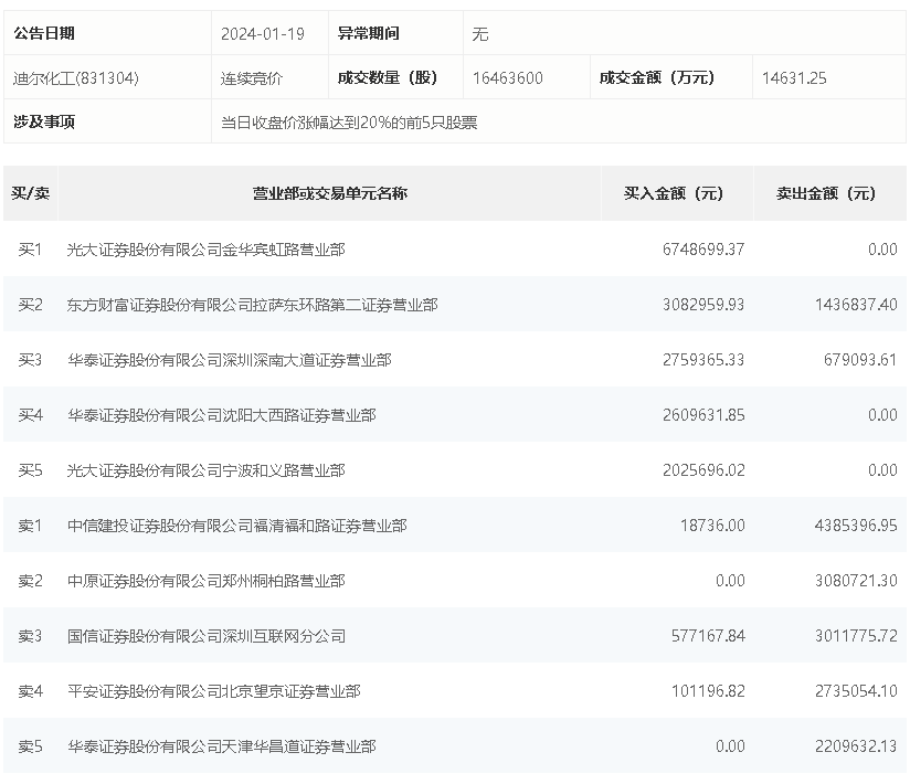 1月19日,迪尔化工今日涨20.35%,全天换手率达25.57%,振幅达28.78%。龙虎榜数据显示,营业部席位合计净买入38.49万元。其中,光大证券金华宾虹路营业部、东方财富证券拉萨东环路第二证券营业部分别买入674.87万元、308.30万元;中信建投证券福清福和路证券营业部、中原证券郑州桐柏路营业部分别卖出438.54万元、308.07万元。