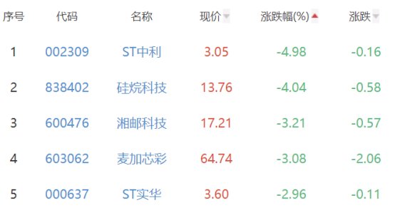 ST中利、硅烷科技、湘邮科技、麦加芯彩、ST实华位列板块涨幅榜后五位,涨幅分别为-4.98%、-4.04%、-3.21%、-3.08%、-2.96%。