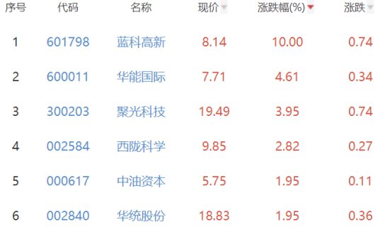 其中,蓝科高新、华能国际、聚光科技、西陇科学、中油资本、华统股份位列板块涨幅榜前五位,涨幅分别为10.00%、4.61%、3.95%、2.82%、1.95%、1.95%。
