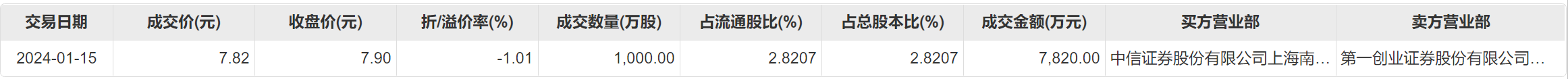 今日大宗交易成交1000万股,成交额7820万元,占当日总成交额的47.35%,成交价7.82元,较市场收盘价折价1.01%。
