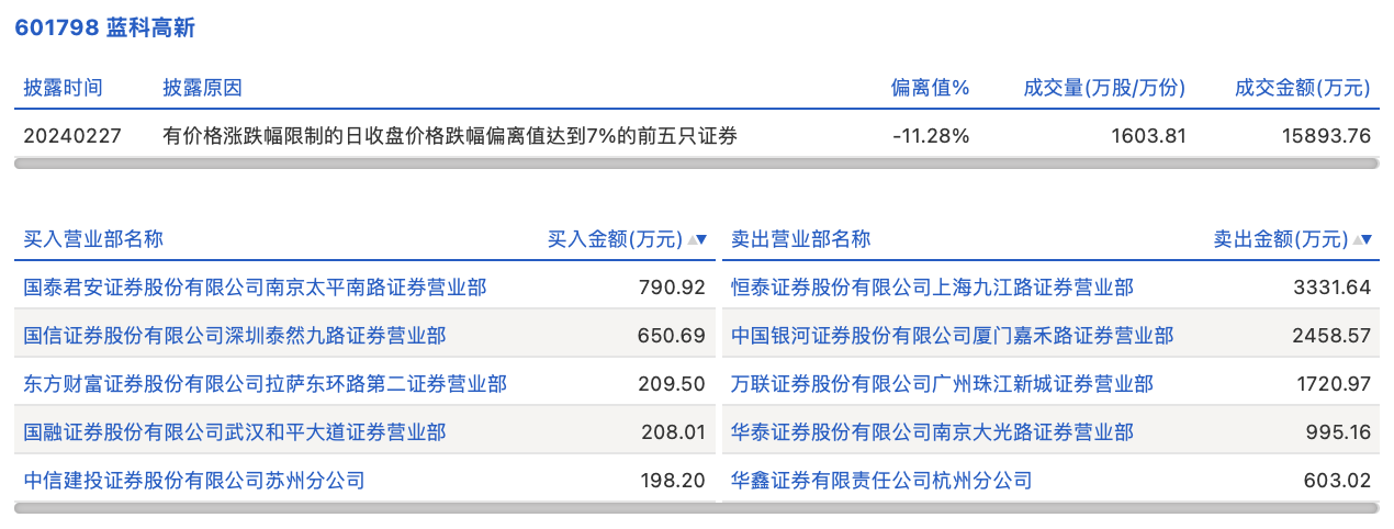 2月27日,蓝科高新今日跌停,龙虎榜数据显示,上榜营业部席位全天成交1.12亿元,占当日总成交金额比例为70.26%。其中,买入金额为2057.32万元,卖出金额为9109.37万元,合计净卖出7052.06万元。