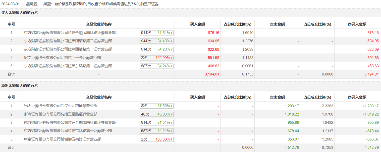 具体来看,光大证券武汉中北路证券营业部、浙商证券杭州五星路证券营业部分别卖出1203.17万元、1019.22万元;东方财富证券拉萨金融城南环路证券营业部、东方财富证券拉萨团结路第二证券营业部分别买入876.16万元、634.95万元。