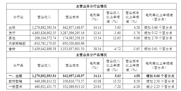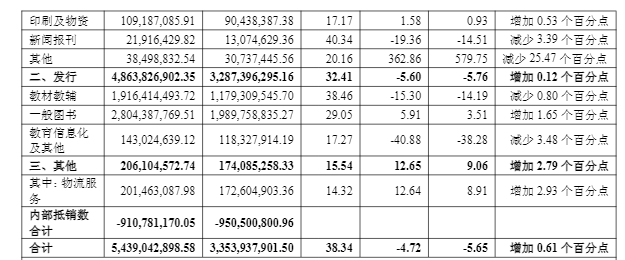 不过,受图书零售市场结构性调整、教育服务行业政策调整和人口结构变化等因素影响,发行分部主营业务收入较上年同期减少2.89亿元,其中,教材教辅较上年同期减少3.46亿元、一般图书较上年同期增加1.57亿元。