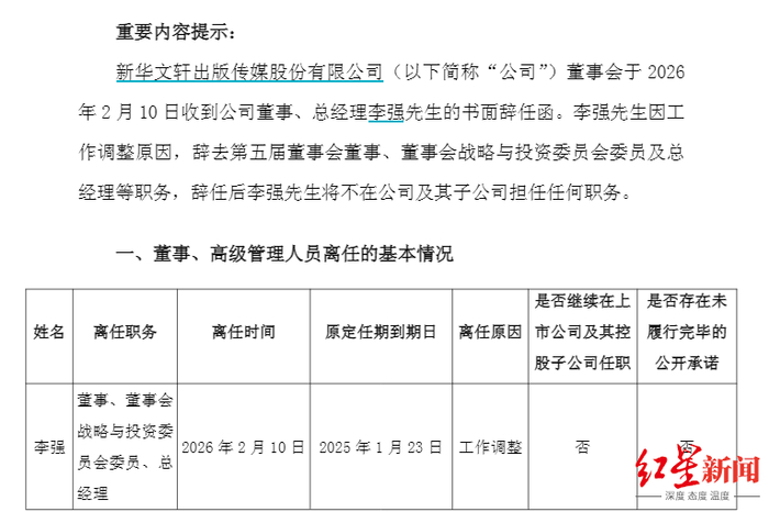 微成都报道 新华文轩(601811.SH)2月10日公告,公司董事会当天收到公司董事、总经理李强的书面辞任函。李强因工作调整原因,辞去第五届董事会董事、总经理等职务,辞任后李强将不在公司及其子公司担任任何职务。