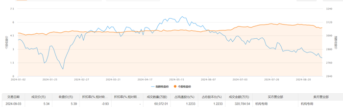 9月3日大宗交易成交6.01亿股,成交额32.08亿元,占当日总成交额的82.35%,成交价5.34元,较市场收盘价5.39元折价0.93%。
