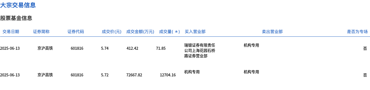 6月13日,京沪高铁大宗交易成交1.28亿股,成交额7.31亿元,占当日总成交额的57.52%,成交均价5.72元,较市场收盘价5.74元折价0.35%,其中最高成交价5.74元,最低成交价5.72元。