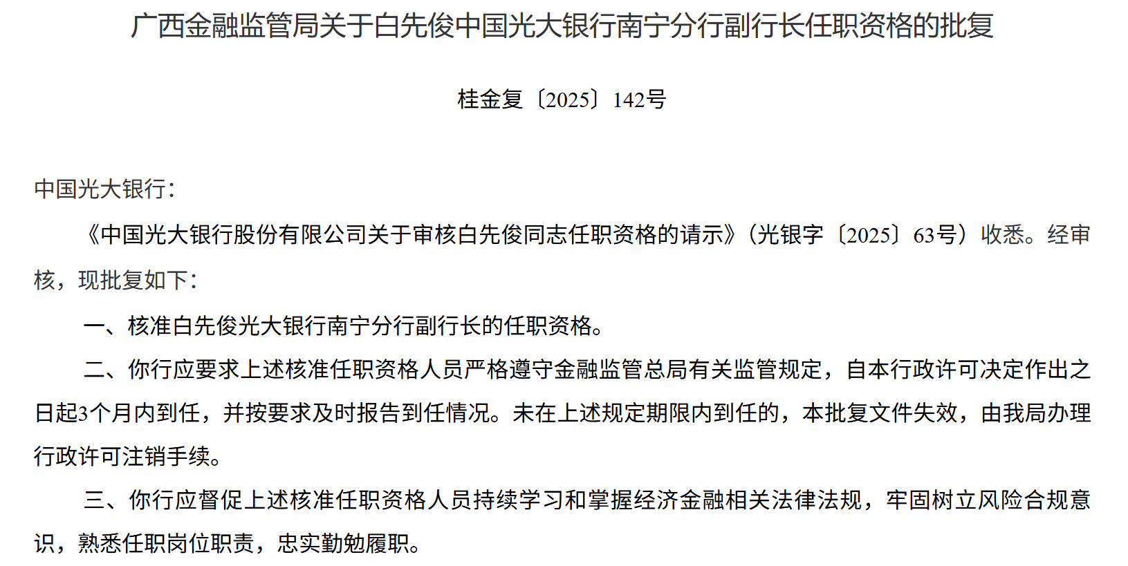 南宁分行副行长任职资格的批复,核准白先俊光大银行南宁分行副行长的任职资格。