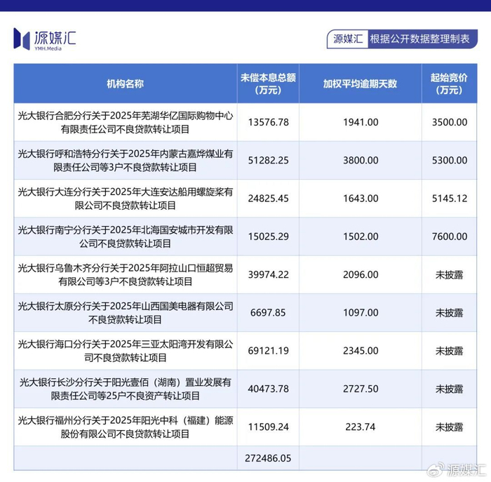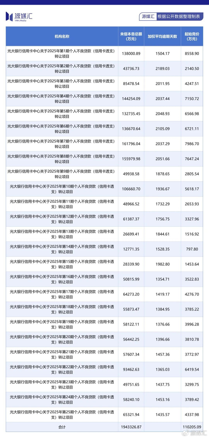 其中,个人贷款方面,光大银行信用卡中心挂出了25期个人不良贷款(信用卡透支)转让项目,合计转让金额约为194.33亿元,竞拍起始价仅为11.02亿元,折价率约为5.67%。