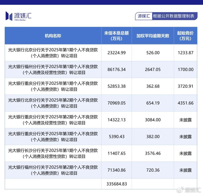 同时,光大银行北京分行、福州分行、重庆分行、长沙分行也分别挂牌转让自己的个人不良贷款转让项目,合计金额约为33.57亿元。