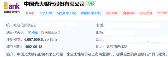 作为一家全国性股份制商业银行,光大银行成立于1992年6月18日,注册资本约为466.79亿元,法定代表人是吴利军,公司于2010年8月18日在上交所挂牌上市。