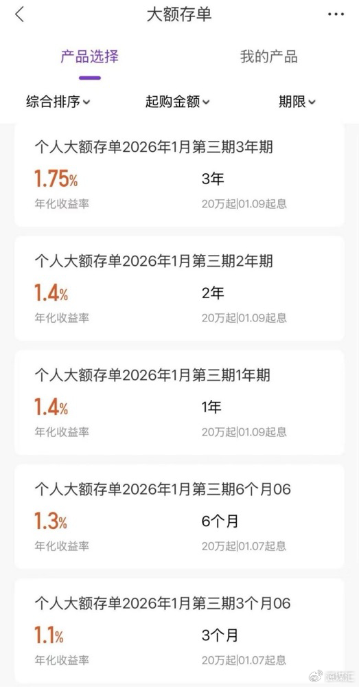 截至2026年1月7日,在光大银行APP的大额存单一栏里,有6个品种,分别是1个月、3个月、6个月、1年期、2年期、3年期,均是20万元起存,利率分别是1.1%、1.1%、1.3%、1.4%、1.4%、1.75%。