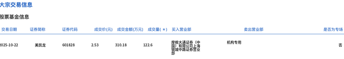 10月22日,美凯龙大宗交易成交122.6万股,成交额310.18万元,占当日总成交额的3.95%,成交价2.53元,较市场收盘价2.85元折价11.23%。
