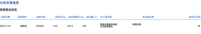 11月13日,美凯龙大宗交易成交140万股,成交额351.4万元,占当日总成交额的3.71%,成交价2.51元,较市场收盘价2.84元折价11.62%。