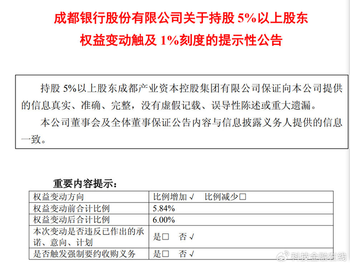 最近,成都银行股东成都产业资本控股集团有限公司还进行了增持,持股比例从5.84%提高到了6%。