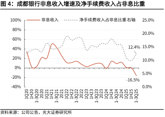 其他非息增速转负,非息占营收比重有所下降。前三季度成都银行非息收入30.4亿(YoY-16.5%),增速较1H25下降16.4pct,占营收比重17.1%,较上半年下降3.3pct。其中,①净手续费及佣金净收入3.75亿(YoY-35%),负增幅度有所收敛,除前期较高基数外,主要受理财手续费收入减少拖累。②净其他非息收入26.6亿(YoY-13%),增速较1H25下降22.7pct。其中,投资收益、公允价值变动损益分别为32、-1.8亿,同比分别多增1.2亿、少增5.6亿。3Q债市利率波动上行,交易户基金估值波动对非息增长形成扰动。