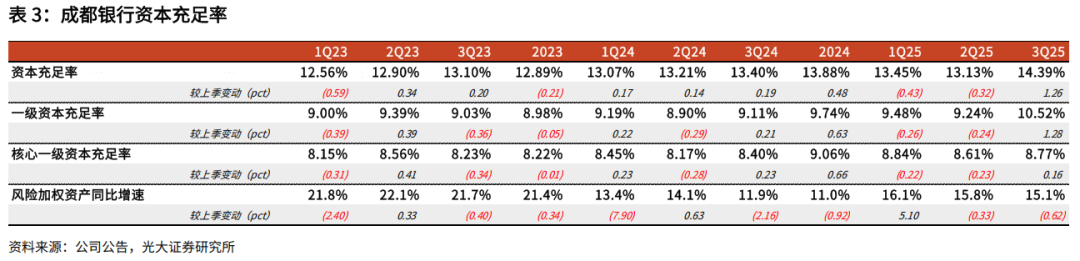 不良率维持低位,风险抵补能力较强。3Q25末,成都银行不良率、关注率分别为0.68%、0.37%,不良率较年中小幅上行2bp,关注率下降7bp,资产质量核心指标运行相对稳定。拨备方面,3Q单季信用减值损失新增4亿,同比少增3.9亿,季末拨贷比、拨备覆盖率分别为2.94%、433.1%,分别较2Q末下降4bp、19.6pct,较年初下降22bp、46.2pct。资产质量较为稳健情况下,公司适度释放拨备反哺利润,风险抵补能力仍维持高位,拨备余粮较厚。