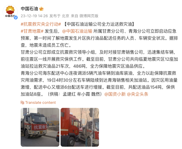 12月19日,据中国石油官博消息,甘肃地震发生后,中国石油运输有限公司所属甘肃分公司、青海分公司立即启动应急预案,第一时间了解地震发生片区执行油品配送任务的人员、车辆安全状况。据排查,地震未造成员工伤亡。