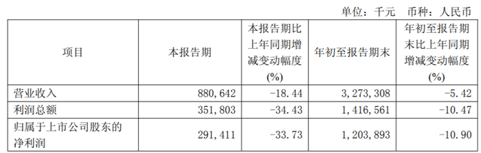 第三季度,紫金银行实现营业收入8.81亿元,同比下降18.44%;归母净利润2.91亿元,同比下降33.73%。