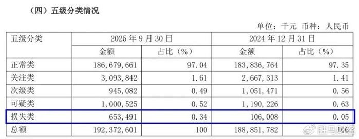 更为严重的是,紫金银行的部分信贷资产已进入实质性损失阶段。截至2025年9月末,该行损失类贷款规模从1.06亿元大幅增长至6.53亿元,增幅高达516%,损失类贷款占比从0.05%跃升至0.34%。