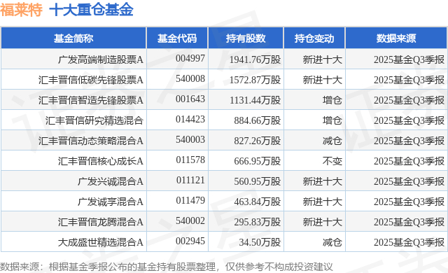 根据2025基金Q3季报公募基金重仓股数据,重仓该股的公募基金共10家,其中持有数量最多的公募基金为广发基金的广发高端制造股票A。广发高端制造股票A目前规模为44.24亿元,最新净值1.5951(11月11日),较上一交易日上涨1.21%,近一年下跌0.88%。该公募基金现任基金经理为郑澄然。郑澄然在任的基金产品包括:广发鑫享灵活配置混合A,管理时间为2020年5月20日至今,期间收益率为56.74%;广发兴诚混合A,管理时间为2021年1月6日至今,期间收益率为-47.29%;广发诚享混合A,管理时间为2021年2月8日至今,期间收益率为-47.36%。