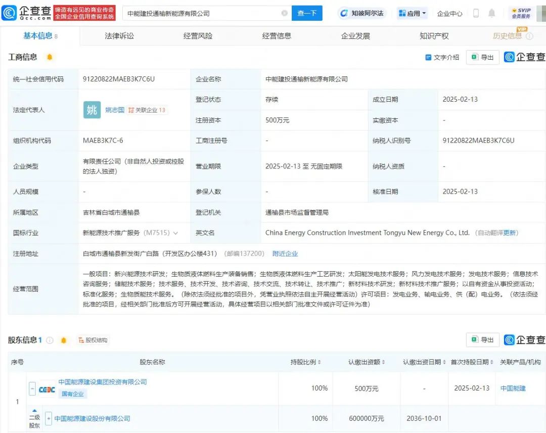 企查查APP显示,近日,中能建投通榆新能源有限公司成立,法定代表人为姚志国,注册资本为500万元,经营范围包含:太阳能发电技术服务;风力发电技术服务;发电技术服务;信息技术咨询服务;新材料技术研发;生物质能技术服务等。企查查股权穿透显示,该公司由中国能建(601868)间接全资持股。