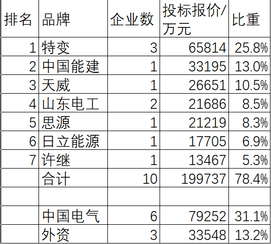 特变、中国能建、天威、山东电工、思源、日立能源、许继7个领先品牌的10家企业合计中199737万元,占总金额的78.4%,品牌集中度较高。