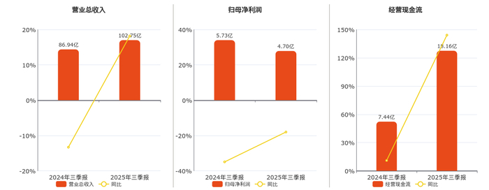 公司营业总收入为102.75亿元,在已披露的同业公司中排名第10,较去年同报告期营业总收入增加15.81亿元,同比较去年同期上涨18.18%。归母净利润为4.70亿元,在已披露的同业公司中排名第13,较去年同报告期归母净利润减少1.03亿元,同比较去年同期下降18.02%。经营活动现金净流入为18.16亿元,在已披露的同业公司中排名第3,较去年同报告期经营活动现金净流入增加10.72亿元,实现2年连续上涨,同比较去年同期上涨144.10%。