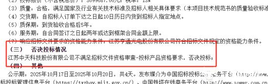 值得一提的是,否决投标情况显示,江苏中天科技股份有限公司因不满足招标文件资格审查-投标产品资格要求,被否决投标。