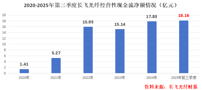 近几年,长飞光纤经营性现金流净额稳步增加,2025年前三季度,经营性现金流净流入18.16亿元,反映出公司现金造血能力提高。