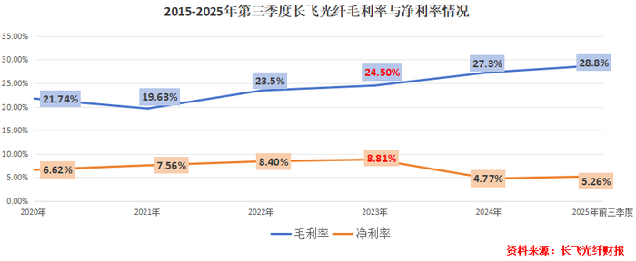 2020-2025年第三季度,公司毛利率攀升至28.8%,可净利率目前只有5.26%,最高时也不过8.81%。