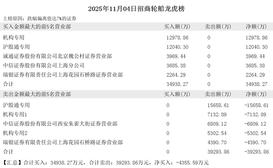 卖出前5席为:沪股通专用、机构专用1、中信证券股份有限公司西安朱雀大街证券营业部、机构专用2、瑞银证券有限责任公司上海花园石桥路证券营业部。共计买入:0万元,共计卖出:39293.86万元。
