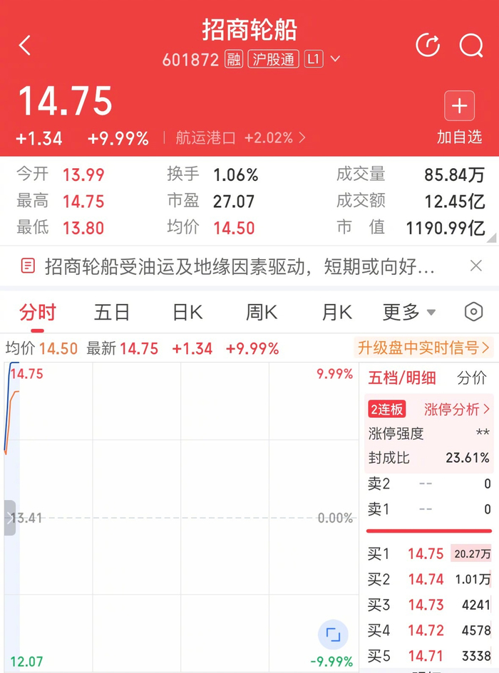 航运板块持续走强招商轮船4天3板创新高