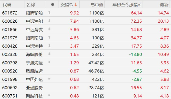 A股航运股集体走强,招商轮船涨停