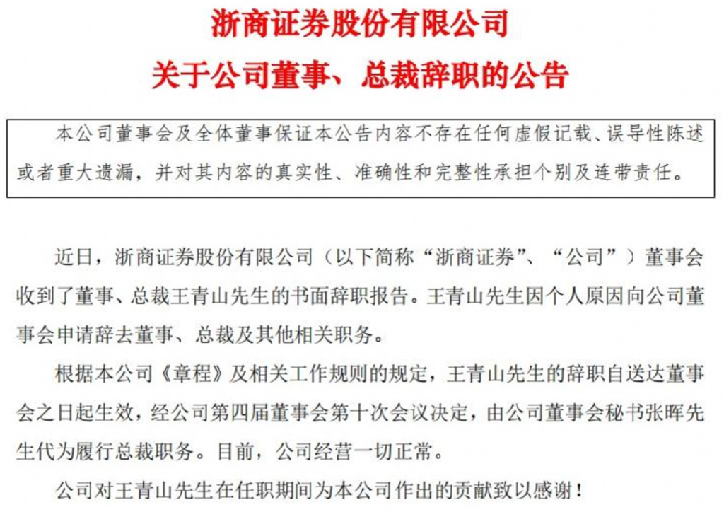 5月12日晚,浙商证券公告,该公司董事会近日收到董事、总裁王青山的书面辞职报告。王青山因个人原因向该公司董事会申请辞去董事、总裁及其他相关职务,经该公司董事会会议决定,由董事会秘书张晖代为履行总裁职务。