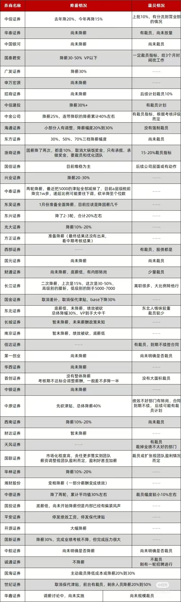 图表:各投行降薪情况!中金、海通证券降幅超20%?中信证券浙商证券降完一轮还要再来?