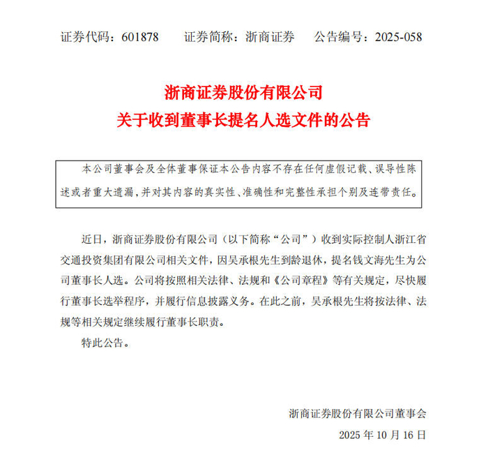 蓝鲸新闻10月16日讯(记者 陈晓娟)日前,浙商证券(601878.SH)公告称,收到实际控制人浙江省交通投资集团有限公司(下称“浙江交通集团”)相关文件,董事长吴承根到龄退休,提名钱文海为公司董事长人选。