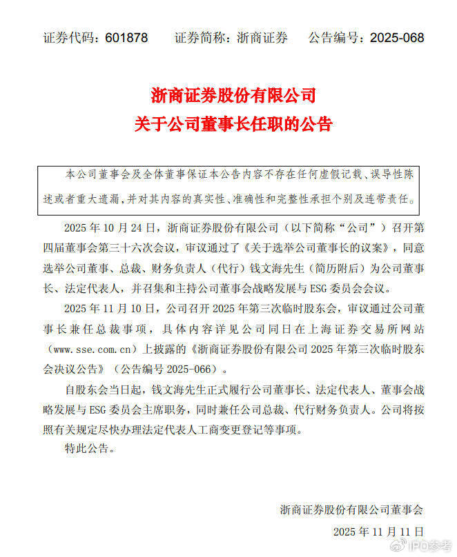 同日,浙商证券召开2025年第三次临时股东会,审议通过董事长兼任总裁事项。自股东会当日起,钱文海正式履行浙商证券董事长、法定代表人、董事会战略发展与ESG委员会主席职务,同时兼任浙商证券总裁、代行财务负责人。