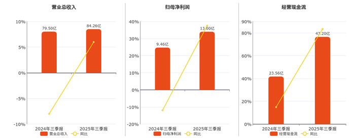 公司营业总收入为84.26亿元,在已披露的同业公司中排名第13,较去年同报告期营业总收入增加4.76亿元,同比较去年同期上涨5.99%。归母净利润为13.00亿元,在已披露的同业公司中排名第13,较去年同报告期归母净利润增加3.55亿元,同比较去年同期上涨37.51%。经营活动现金净流入为43.20亿元,在已披露的同业公司中排名第7,较去年同报告期经营活动现金净流入增加19.65亿元,实现2年连续上涨,同比较去年同期上涨83.40%。