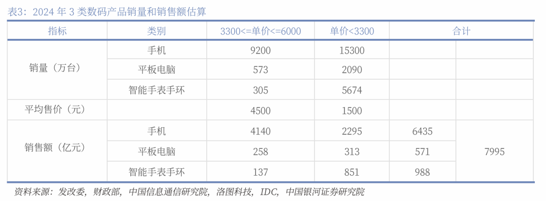 2024年享受补贴标准售价区间的3类数码产品合计销售金额估算为8000亿元左右。假设3类数码产品售价在3300至6000元之间和3300元以下(即享受补贴标准的售价区间产品)的销售均价分别为4500和1500元,则可以计算出,2024年售价在3300至6000元之间和3300元以下的数码产品的销售额,其中手机的销售额分别为4140和2295亿元(合计6435亿元),平板电脑的销售额分别为258和313亿元(合计571亿元),智能手表手环的销售额分别为137和851亿元(合计988亿元),3类数码产品合计销售金额为7995亿元。