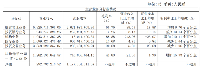 上半年,其实现财富管理业务营收59.25亿元,同比增长35.55%,占公司营业收入的43.11%,毛利率55.75%,同比增长6.76个百分点;投资银行业务营收2.44亿元,同比增长3.13%,占公司营业收入的1.78%,毛利率2.26%,比上年减少了13.14个百分点。