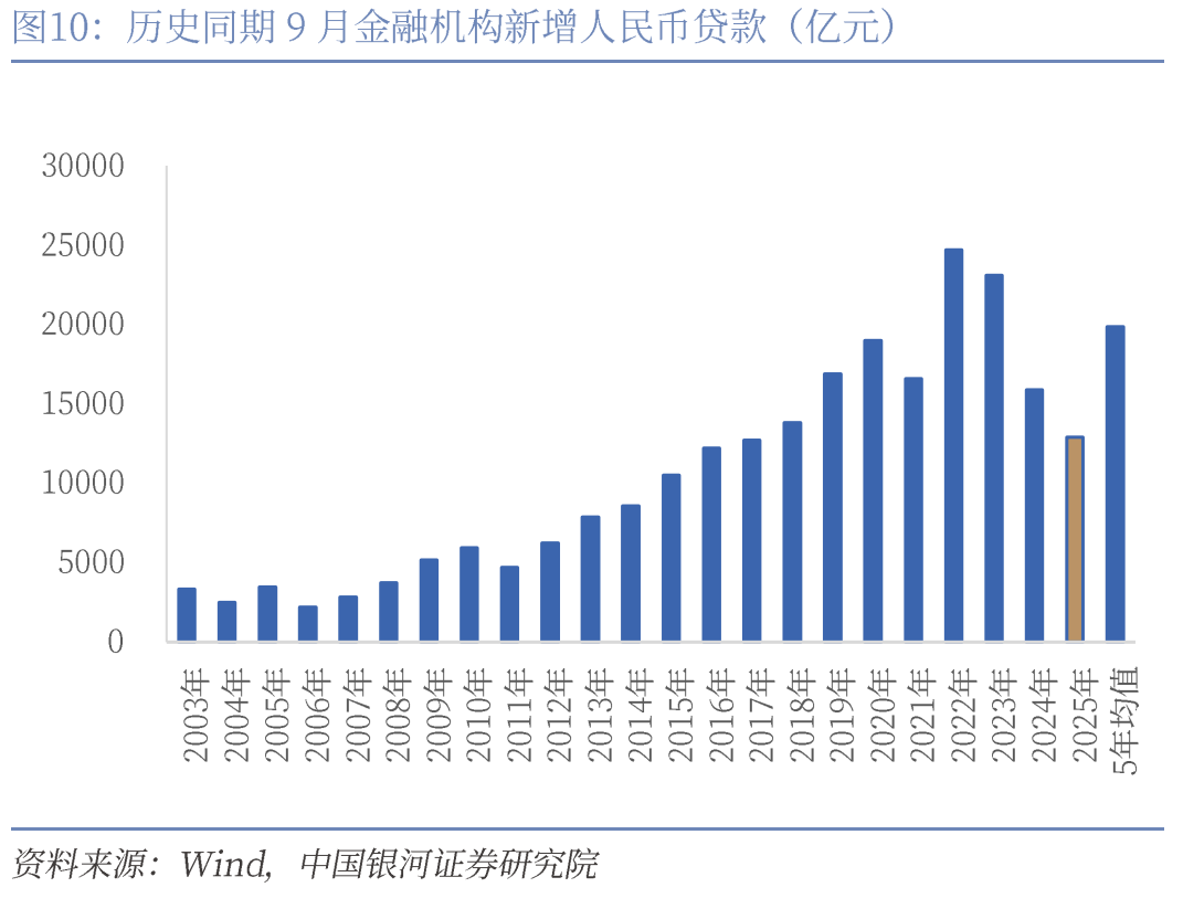 9月金融机构新增人民币贷款1.29万亿元,同比少增3000亿元。居民短贷同比少增1279亿元,居民中长期贷款同比多增200亿元。9月地产销售好于去年同期支撑居民中长期贷款同比多增。企业信贷不及去年同期主要来自票据融资的拖累。企业短贷同比多增2500亿元,企业中长贷同比小幅少增500亿元。票据融资同比少增4712亿元,主要由于去年同期有较为明显的票据冲量现象,而今年月末票据利率上行,无明显的冲量现象。非银贷款同比增加356亿元。