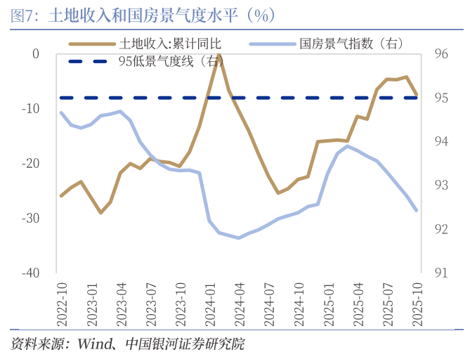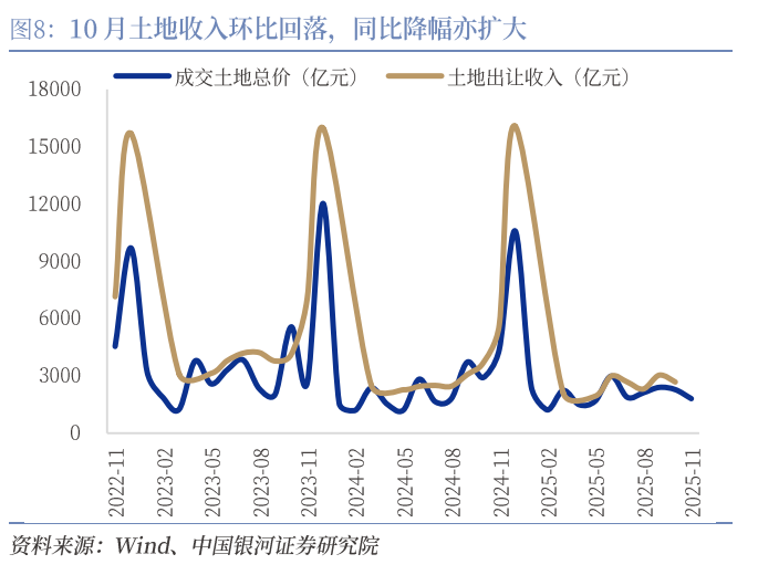政府性基金收入方面,土地收入环比回落,同比降幅亦显著扩大。1-10月政府性基金收入累计增速-2.8%(前值-0.5%),降幅有所走阔,或与10月份土地市场热度回落有关。10月土地出让收入当月值为2680亿元(前值3039亿元),累计增速下滑至-7.4%(前值-4.2%),土地成交规模环比回落,同比降幅亦显著扩大。根据克而瑞地产研究数据,10月土地成交建筑面积与金额分别环比下降13%和20%;同比来看,二者降幅进一步扩大至25%和33%,均创下年内最高同比跌幅。不过从土地成交规模收缩的实际情况来看,当前地方土地市场供求已处于更合理的规模水平。