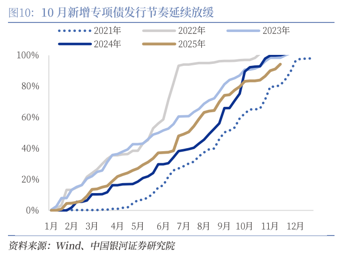 基建增速降幅走阔,社保、科技和教育支出均有所放缓。1-10月一本账支出累计增速为2%(前值3.1%),当月同比增速转负降至-9.8%(前值3.1%)。支出结构方面,基建四项合计支出增速降至-6.6%(前值-4.5%),其中节能环保累计支出增速7%(前值8.8%),交通运输累计增速0.2%(前值1.8%),农林水事务累计增速-11.7%(前值-9%),城乡事务累计-7.3%(前值-5.8%),均有不同程度下滑;此外节能环保当月同比增速-11.8%(前值22.6%),农林水事务当月同比-32.8%(前值-6.9%),增速或受气候与资金向化债领域倾斜影响有关。民生支出方面,社保(同比9.3%)、科技(5.7%)和教育(同比4.7%)支出累计增速较前值均有所放缓。10月国债发行节奏继续放缓, 1-9月共发行国债11.95万亿元,发行进度达到78.9%,低于去年同期0.5个百分点。1-10月共发行国债13.15万亿元,发行进度达到86.8%,低于去年同期1.8个百分点。