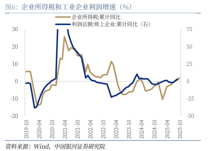 税收结构方面,印花税(含证券交易印花税)保持大幅增长,增值税、企业所得税、个人所得税、消费税和地产五税均有不同幅度改善。1-10月印花税同比增长29.5%(前值34.5%),其中证券交易印花税同比增长88.1%(前值103.4%),去年同期证券交易印花税占税收收入权重0.57%,对应拉动税收收入增速0.5个百分点。增值税收入累计增速为4%(前值3.6%),1-10月工业增加值累计增速6.1%(前值6.2%),工业生产依旧维持韧性。企业所得税连续三个月改善本月上行至1.9%(前值0.8%),当月同比增速为7.3%(前值19.6%)。消费税连续两个月上行至2.4%(前值2.2%),当月同比增速为4.4%(前值3.8%)。个人所得税累计增速11.5%(前值9.7%),当月同比增速27.3%(前值16.7%)。此外,地产五税累计增速降幅小幅收窄,基本与10月地产高频数据走势相匹配。