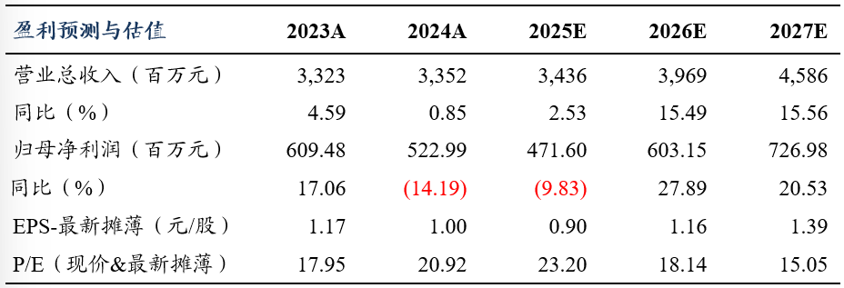 考虑到当前行业下游景气度偏低和价格竞争加剧影响,公司短期利润承压,我们下调公司2025-2027年归母净利润预测值分别为4.72(原值6.41)/6.03(原值7.60)/7.27(原值8.96)亿元,当前股价对应动态PE分别为23/18/15倍,维持公司“增持”评级。