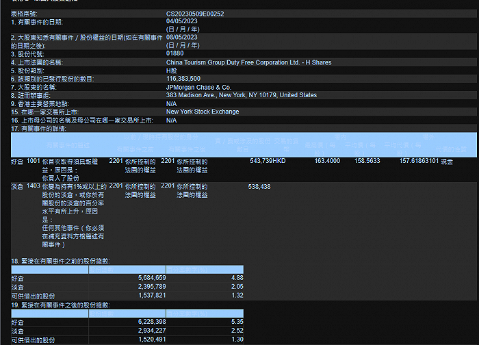 摩根大通将中国中免H股的持股比例从4.88%增加到5.35%