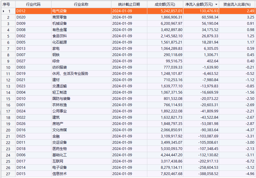 上证报中国证券网讯 Choice数据统计,今日A股主力资金净流出119.74亿元;行业方面,电气设备净流入居首,为13.05亿元,商贸零售净流入6.06亿元,机械设备净流入5.62亿元;净流出金额最多的是信息技术,高达38.81亿元,电子设备净流出25.86亿元。个股方面,主力资金净流入前三的是中国中免、隆基绿能、京山轻机,分别净流入5.1亿元、4.61亿元、4.08亿元;净流出前三的是赛力斯、银宝山新、清源股份,分别净流出3.91亿元、3.52亿元、2.69亿元。
