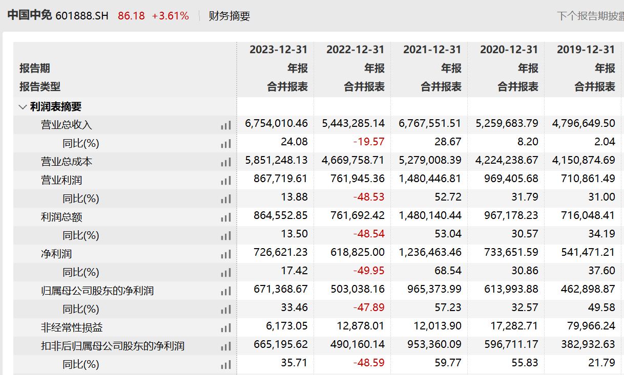 营收、净利润同比分别增长24%、33%以上,随着2023年年报披露,股价一年大跌61%的“免税茅”中国中免(601888.SH),去年的业绩也变得明了。